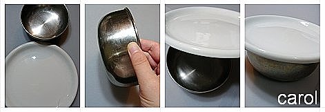 準備一個大盤子及一個底部為圓弧形的不鏽鋼盆,再將不鏽鋼盆放在大盤