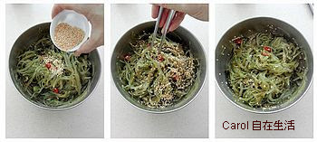 1.鹽漬海帶梗絲加入冷水(份量外)浸泡 2小時去除多餘鹽分